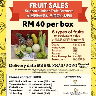 Support Johor fruit farmers by buying a box of fruits from them. Free delivery for purchasers in Seputeh constituency only https://t.co/DnHcF4zzYrMujahid Yusof Rawa