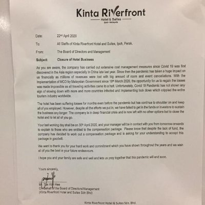 Received this from a friend, covid 19 mercilessly put hotel bussiness on its knees and chop off the heads... Just tips of the iceberg for 56ks staff working in hotels all over Malaysia.... #COVID19Malaysia #Workers https://t.co/UYSTYraU76𝕄𝕦𝕗𝕥𝕚 𝕄𝕖𝕟𝕜