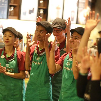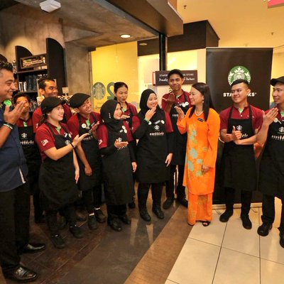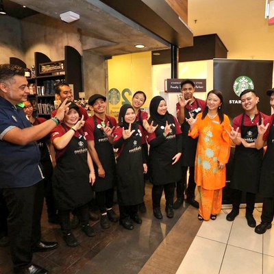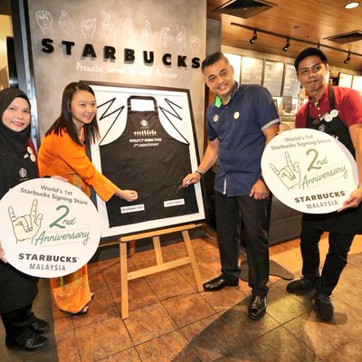 Sambutan ulangtahun ke-2 Starbucks Signing Store di Bangsar Village II yang diuruskan sepenuhnya oleh mereka yang OKU pendengaran malah mereka menggunakan bahasa isyarat untuk berkomunikasi dengan pelanggan